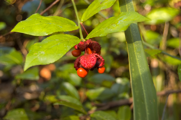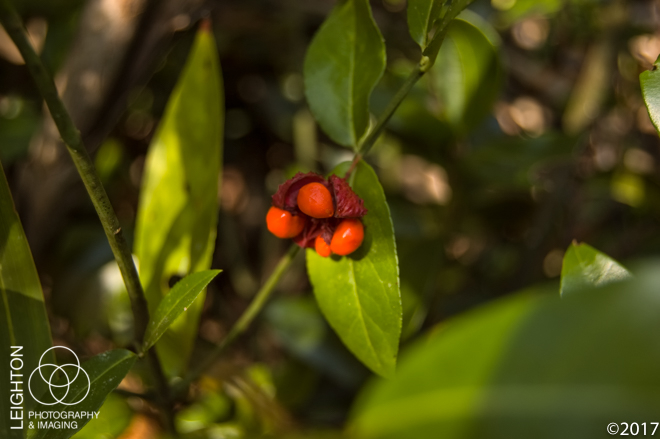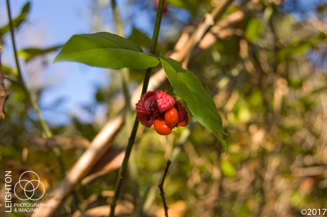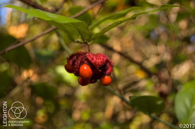 The American strawberry bush – also known by many other names such as the “hearts-a-bustin and “hearts-bustin‘-with-love”, is a native member of the bittersweet family is one of those oddly beautiful plants you find sometimes in autumn while out in some of the more remote places in the Untied States. Found in all of the eastern states (excluding New England), most of the lower Midwest states, and as far west as Texas and Oklahoma, it literally looks like a strawberry growing on a shrub that is bursting with bright red seeds exposed within. As with many red-colored fruits in nature, this is best not to be eaten, as it has been reported to induce severe diarrhea in humans. The leaves, bark and stems are enjoyed by deer and other native wildlife who spread the seeds after consumption. These were found growing wild in Florida’s Ocala National Forest near Juniper Springs.